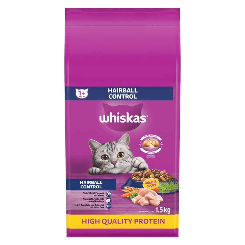 Cat parents love the independent spirit of their pets but know they still need loving care. That’s why all WHISKAS Dry Cat Food recipes are made with real high quality protein and real chicken, beef, seafood, or other natural flavours. WHISKAS provides a 100 nutritionally complete and balanced meal to keep your cat happy, vital, and full of life. WHISKAS Dry Cat Food Hairball Control for adult cats 1 year and older has a crunchy kibble outer layer, which helps support your cat’s oral care, and a tasty, soft, meaty centre. Together, they deliver high quality protein in an irresistible flavour cats love. Made with natural fibres for hairball control and no artificial flavours or colours, WHISKAS Dry Cat Food Hairball Control is made with real chicken. Conveniently, WHISKAS Dry Cat Food does not require refrigeration after opening and can be left out in a bowl all day without the risk of drying out or going stale. This makes it easy to travel with, too. As the makers of WHISKAS we recommend that two thirds of your cat’s daily calories come from wet cat food and one third from dry cat food, so try mixing it up at mealtime by alternating WHISKAS Dry Cat Food with WHISKAS Wet Cat Food. It’s a good way to keep your cat interested and happy for 100 more purrs!MADE IN NORTH AMERICA: All of our WHISKAS products are made in North America. HOW TO STORE: WHISKAS dry products should be stored in a cool dry place, away from areas of humidity or odorous materials. MIX IT UP: Alternate WHISKAS Dry Cat Food with WHISKAS Wet Cat Food for 100 more purrs. THEIR FAVOURITE MEAL: Tasty natural chicken flavour cats love with no artificial flavours and no artificial colours. TASTY POCKET KIBBLES: Crunchy outside, soft meaty centre, irresistible flavour. FOR ADULT CATS: This 1.5 kg bag of WHISKAS Hairball Control with Real Chicken Flavour is formulated to help control hairballs in your cat’s prime years.