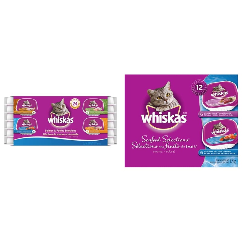 WHISKAS Salmon and Poultry Selections Wet Cat Food Pat, 100g (24 Pack) As the makers of WHISKAS we love cats for their independent spirits but understand they still need love and care. We know that wet food is an important part of a cat’s diet. That’s why we’ve created WHISKAS 100g Trays to serve up delicious real poultry, meat or seafood. WHISKAS 100g Tray Salmon & Poultry Selections 24-Pack Contains 6x100g WHISKAS Chicken & Liver Dinner, 6x100g WHISKAS Chicken Dinner, 6x100g WHISKAS Turkey & Giblets Dinner, and 6x100g WHISKAS Savoury Salmon Dinner. WHISKAS Seafood Selections Wet Cat Food Pat Multipack – 6 Whitefish and Tuna, 6 Salmon, 12x100g Tray As the makers of WHISKAS we love cats for their independent spirits but understand they still need love and care. We know that wet food is an important part of a cat’s diet. That’s why we’ve created WHISKAS 100g trays to serve up delicious real poultry, meat or seafood. WHISKAS 100g Tray SEAFOOD SELECTIONS 12-Pack Contains 6x100g WHISKAS Whitefish and Tuna Dinner and 6x100g WHISKAS Savoury Salmon Dinner.100g tray size, suitable for adult cats and kittens. Includes 24 trays of Salmon and Poultry Selections, 6 trays of Whitefish and Tuna, and 6 trays of Salmon Dinners. Mix of WHISKAS Wet Cat Food and WHISKAS Dry Cat Food recommended for a balanced diet; wet cat food should be refrigerated after opening. Provides the taste cats love and the hydration they need to support a healthy urinary tract, with no artificial flavors, gluten, corn, wheat or soy. 100g trays of WHISKAS Pat wet cat food for adult cats and kittens, containing tasty salmon, poultry, seafood, whitefish, and tuna flavors (Total 36 trays).