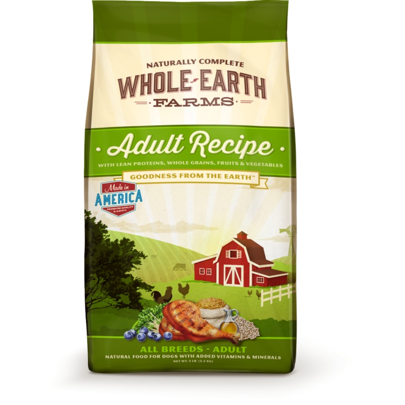 Whole Earth Farms Adult recipe dry dog food provides a natural dog food recipe featuring healthy whole grains to support the nutrition needs of your adult dog. Whole Earth Farms is a wholesome line of naturally nutritious dog food and cat food that offers