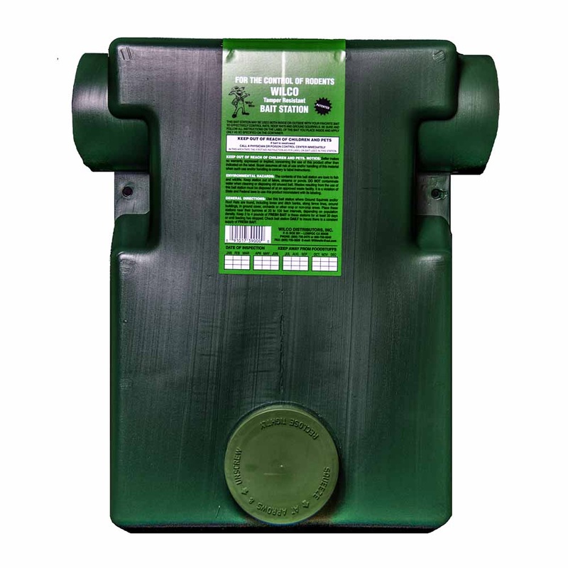 The Wilco Squirrel Bait Station is molded of heavy-duty dark green plastic that withstands abuse. Its design is ideal for ground squirrels, while discouraging non-target animals. It is vented to help keep the bait fresh, and has a special baffle to keep the bait dry and in the compartment where it belongs.Has child-resistant caps for refilling, and anchor points.Always secure poison in bait stations so that it is not available to children, pets or wild animals. When placing bait stations outside, consider all areas where bait should be placed such as wood piles, storage sheds and fence rows. They should be placed about 50 feet apart around buildings or along landscaped areas surrounding buildings. Grain baits can no longer be broadcast on fields; they must be used in bait stations.