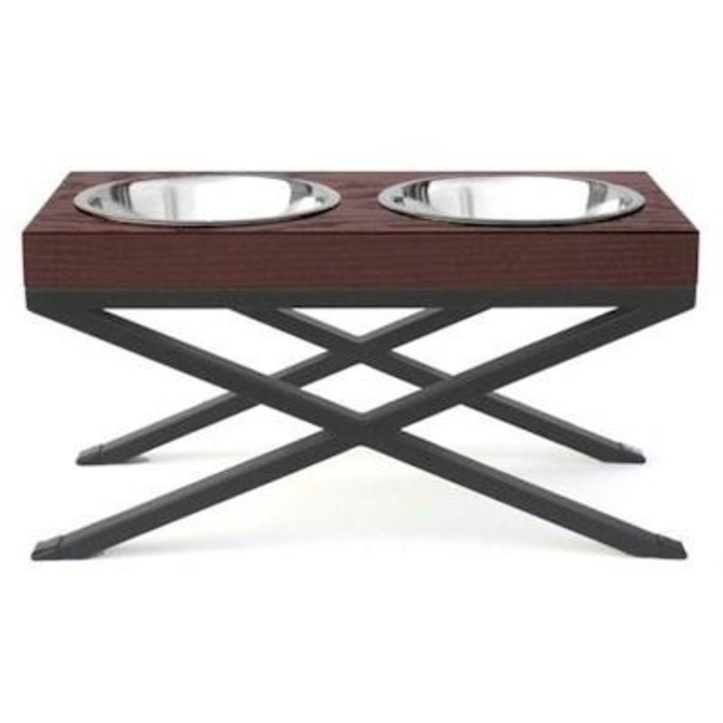 Features:Size: 17" L x 8.5" W x 6" H1 Quart CapacityWrought iron provides sturdy constructionBlock style wooden top adds a luxurious lookEach comes with two stainless steel bowls. Bowls detach for easy cleaning Our new Woodsman Double Diner features an ele