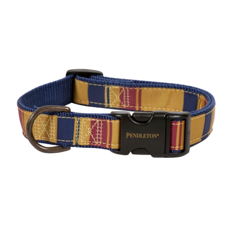 This adjustable collar features grosgrain ribbon in the colors of the Yellowstone National Park stitched onto durable blue nylon webbing. It features a quick release buckle with antique brass hardware. Adjustable. Made in USA.